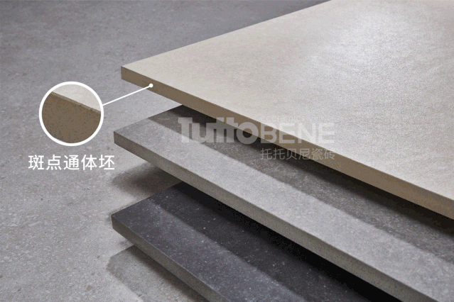 因此托托贝尼尤为注重厚砖产品砖坯的塑造,从斑点坯到大颗粒斑点通体坯的技术突破,再根据不同釉面颜色而打造的纯色砖坯,以及超黑/超白+大颗粒通体坯的设计,从坯体底层到釉面层真正做到表里如一,实现全通体的自然之美。